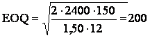 Например, фирма сбывает равномерно в течение года (N = 12 месяцев) в общей сложности D = 2400 штук изделий. Издержки хранения составляют H = 1,50 руб./шт. в единицу времени (за месяц), издержки заказа составляют O = 150 руб./заказ, тогда оптимальный объем пополнения запасов (величина заказа) равен:
