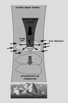 Лазерный термооптический (ТО) микроскоп создан в АНК «Институт тепло- и массообмена им. А.В.Лыкова» НАН Б и представляет собой экспериментальный образец анализатора клеток. позволяющего определить различные параметры отдельных живых клеток. принцип действия термооптического микроскопа основан на облучении отдельный клетки сфокусированным импульсным лазерным пучком накачки (видимый диапазон, 10 нс), индуцирующего нагрев в клетке вследствие безизлучательной релаксации поглощенной компонентами клетки световой энергии. Наведенные тепловые эффекты и реакция клетки на них регистрируются оптическим методом с помощью дополнительного пробного лазера, обеспечивающим интегральный отклик клетки на лазерный импульс и визуализацию локальных тепловых эффектов внутри клетки с временным разрешением (термооптическое изображение). Указанные ТО-сигналы могут быть получены при неразрушающем воздействии лазера на клетки и обеспечивают возможность мониторинга состояния отдельных клеток при их взаимодействии с факторами окружающей среды.