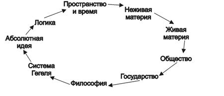 Таким образом, абсолютная идея начинает долгий путь самопознания своих возможностей, первый этап которого — логика, развитие чистой мысли. Абсолютная идея как бы спрашивает себя: "Что я есть? Что я могу? В чём моя суетность?". Не удовлетворяясь игрой в чистые понятия и желая иметь "место" и "длительность", она превращается в пространство и время. Далее происходит материализация идеи — овеществление выработанных ранее понятий: возникает неживая материя ("окаменелый интеллект"). Из неживой субстанции появляется живая. На основе живой материи возникает человек и человеческое общество. Развиваясь, общество рождает государство — высшую ступень мирового духа, по мнению Гегеля. В лоне государства возникает философия как попытка субъективного осмысления объективного саморазвития абсолютной идеи. В лице философов она всё больше приближается к пониманию собственной сущности. Эволюция философии в конце концов приводит к появлению философской системы Гегеля, которая, наконец, даёт исчерпывающее объяснение — откуда и как всё возникло, и почему это "всё" именно таково. Абсолютная идея, образно говоря, теперь может передохнуть и удовлетворённо сказать себе устами философа: "Я прошла все ступени развития, стала всем, чем могла стать, разобралась в своей собственной сущности". Круг замкнулся (см. рис. 4).