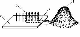 1 — муравейник; 2 — доска с колышками; 3 — лакомство; 4 — траектория муравья-разведчика. |