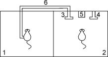 1 — левая клетка. 2 — правая клетка 3 — лёгкий рычаг 4 — трудный рычаг 5 — кормушка 6 — соединительные провода |