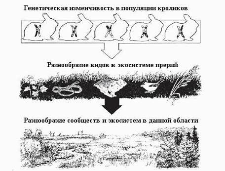 Рис. 1 Биологическое разнообразие включает генетическое разнообразие (наследственную изменчивость внутри каждого вида), видовое разнообразие (набор видов в данной экосистеме) и разнообразие сообществ/экосистем (местообитаний и экосистем в данной территории)