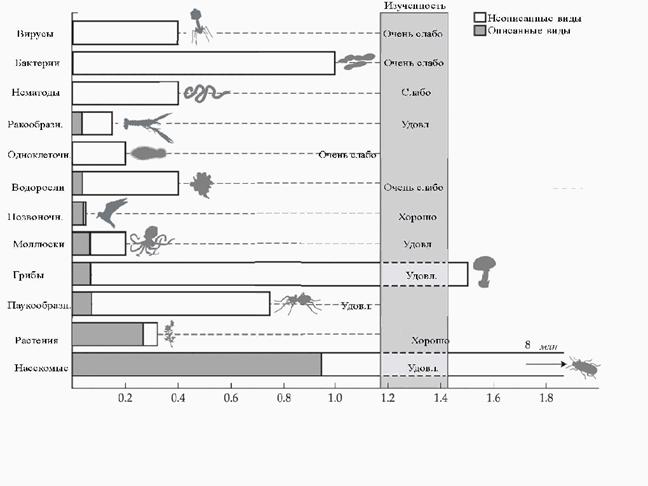 Рис. 4. Число описанных видов обозначено закрашенными частями столбиков; традиционные оценки реального числа существующих видов для этих групп организмов предполагают, что его надо увеличить на 100 000 видов, они показаны на закрашенной колонке справа (позвоночные включены для сравнения). Число неидентифицированных видов особенно неясно для различных групп микроорганизмов. Общее число существующих видов по некоторым оценкам может достигать 5–10 млн, или даже 30–150 млн.