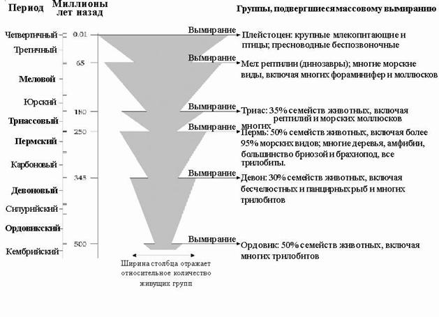 С момента возникновения жизни видовое разнообразие на Земле постепенно увеличивалось. Это увеличение не было равномерным. Оно сопровождалось периодами с высокими темпами видообразования, на смену которым приходили периоды с низкой скоростью изменений и прерывалось пятью вспышками массовых вымираний. Наиболее массовое вымирание произошло в конце Пермского периода, 250 млн лет назад, когда по приблизительным оценкам вымерло 77–96% всех видов морских животных (рис. 1.7).