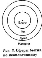 Неоплатонисты стремились дать философскую картину всего существующего, в том числе Космоса в целом. Нельзя понять жизнь субъекта вне Космоса, равно как и жизнь Космоса без субъекта. Существующее устроено иерархически: Единое-Благо, Ум, Душа, Материя. Высшее место в иерархии принадлежит Единому-Благу. Единое — это подлинно первосущее, охват всего в одной точке. Если, считают неоплатоники, вы признаете существование разного, например, разумного и неразумного, то выше его есть предел того и другого, что уже не является ни тем, ни другим. Единое-Благо достигается не рациональным путем, а лишь в результате сверхразумного экстаза. Само собой разумеется, что в результате такого экстаза субъект уходит от различного рода земных трудностей.