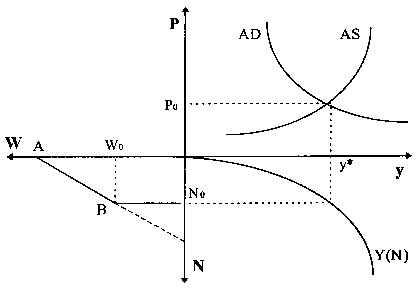 В первом квадранте определяется величина эффективного спроса — у'. Величина эффективного спроса проецируется на график производственной функции короткого периода y(N), в результате определяется спрос на труд в размере N02. Проекция найденного значения спроса на труд на график предельной производительности определяет цену, по которой предприниматели согласны приобрести количество труда N0, то есть ставку номинальной зарплаты – W0.