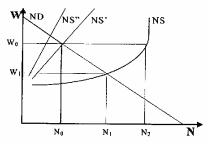 Если же цена предложения труда превысит цену спроса на труд, то есть если кривая предложения труда сместится в положение NS", то достижение полной занятости невозможно, более того, в этом случае проблематичным становится и достижение равновесия на рынке труда, так как не выполняется условие неравенства (6).