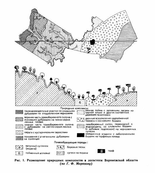 Чтобы заметить тесную взаимную пространственную приуроченность перечисленных компонентов и реальность образуемых ими сочетаний, вовсе не обязательно проделывать маршруты в сотни и тысячи километров по меридиану. Наглядное представление о географических комплексах может дать небольшой профиль, проложенный от речной долины к ближайшему водоразделу. Именно такие профили ввели в практику географических исследований ученики В. В. Докучаева Г. И. Танфильев (1857—1928), Г. Ф. Морозов (1867—1920) и Г. Н. Высоцкий (1865—1940) около ста лет назад. В качестве удачного примере можно привести комплексный профиль участка лесостепи из знаменитой книги Г. Ф. Морозова “Учение о лесе”, впервые изданной в 1920 году (рис. 1). Этот профиль сопровождается планом, так что в совокупности получается как бы объемное трехмерное представление сравнительно небольшого пространства, отчетливо дифференцированного на последовательно сменяющие друг друга комплексы. Каждый из девяти комплексов отличается своим положением в рельефе, материнской породой, почвой, растительностью. Если бы по этому профилю проводились наблюдения, над микроклиматом, уровнем грунтовых вод и другими природными явлениями, то в них непременно обнаружились бы различия по участкам профиля.