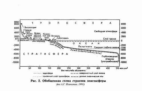 Структура эпигеосферы чрезвычайно сложна, причем четко выражены как ее вертикальная, так и горизонтальная составляющие. Три основных структурных блока — тропосфера, гидросфера и осадочная оболочка земной коры (стратисфера) — расположены в виде ярусов в соответствии с их плотностью. Четвертый блок (компонент) — биосфера как совокупность всех организмов — не образует самостоятельной оболочки, а пронизывает все три главных яруса. При этом живое вещество в основном сосредоточено в зонах непосредственного контакта трех неорганических сфер, образуя, по выражению В. И. Вернадского, “пленки жизни”[7]. Таких “пленок”, а по существу внутренних контактных структурных ярусов эпигеосферы, получается три: на стыках атмосферы — литосферы, атмосферы — гидросферы (точнее — Мирового океана, или океаносферы) и океаносферы — литосферы (рис. 2).