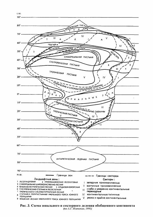 Закон зональности имеет универсальное географическое значение, прямо или косвенно проявляющееся во всей эпигеосфере. Свое комплексное выражение он находит в формировании ландшафтных зон — крупнейших геосистем регионального уровня. Схематично зональная структура всей суши может быть представлена на рисунке 3 в виде зонального деления обобщенного континента. Такую форму имела бы суша земного шара, если ее собрать в единый массив путем суммирования площадей материков по всем параллелям.