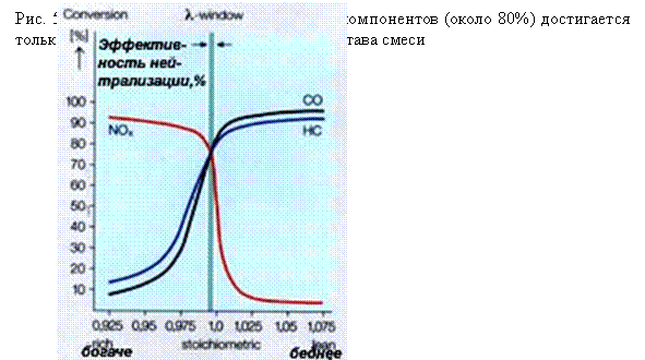 Трехкомпонентный нейтрализатор наиболее эффективен при определенном составе отработавших газов (рис.5). Это значит, что нужно очень точно выдерживать состав горючей смеси возле так называемого стехиометрического отношения воздух/топливо, значение которого лежит в узких пределах 14,5 — 14,7. Если горючая смесь будет богаче, то упадет эффективность нейтрализации СО и СН, если беднее — NOX.