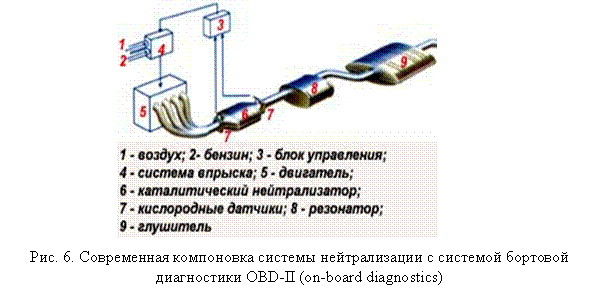 На рис.7 изображен современный трехкомпонентный каталитический нейтрализатор. Второй кислородный датчик нужен для новейших систем бортовой диагностики OBD-II и отслеживает эффективность нейтрализации.