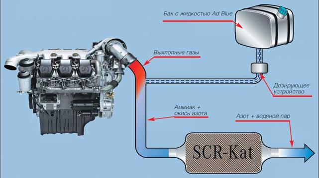Принцип действия системы SCR (рис.16) заключается в химической реакции аммиака с окисью азота выхлопных газов, в результате которой образуются безвредный азот и водяной пар.