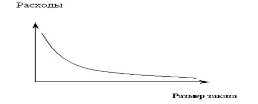 И расходы по доставке, и расходы по хранению зависят от размера заказа, однако, характер зависимости каждой из этих статей расходов от объема заказа разный. Расходы по доставке товаров при увеличении размера заказа уменьшаются, так как перевозки осуществляются более крупными партиями и, следовательно, реже. График этой зависимости, имеющей форму гиперболы, представлен на рис. 3.
