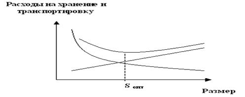 Сложив оба графика, получим кривую, отражающую характер зависимости совокупных издержек по транспортировке и хранению от размера заказываемой партии (рис. 5).