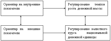 Под валютной интервенцией понимается политика купли-продажи центральным банком иностранной валюты на национальную на валютном рынке. Одним из основных принципов определения стратегии центральных банков служит ориентация на регулирование темпа роста денежной массы в национальной экономики или регулирование валютного курса национальной денежной единицы по отношению к какой-либо стабильной иностранной валюте т.е. на внутренние или внешние показатели (рис 1)[7].
