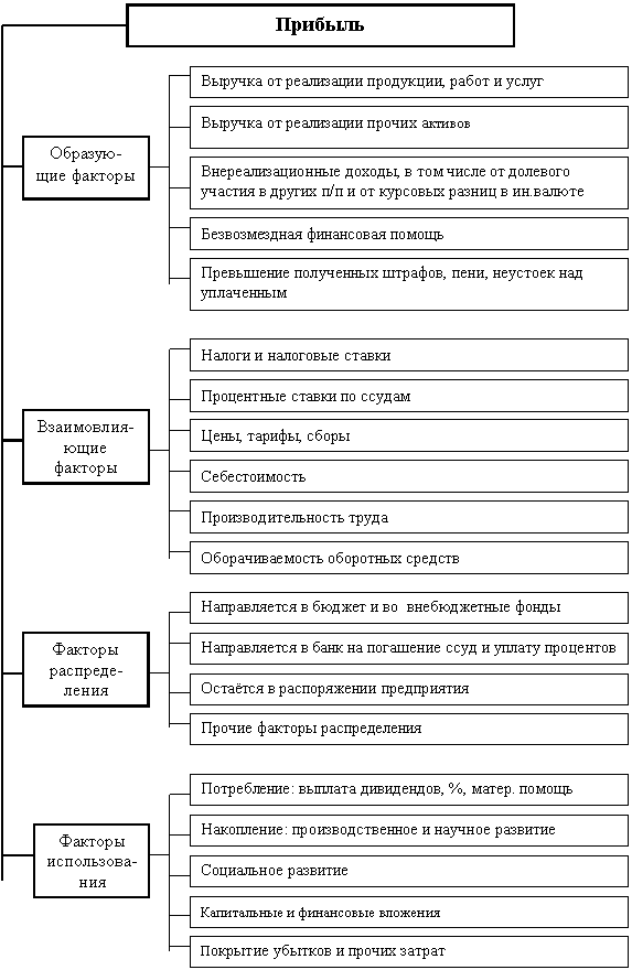 Взаимовлияющие факторы включают внешние и, определяемые финансово-кредитной политикой государства, в том числе налоги и налоговые ставки, процентные ставки по ссудам, в определённой мере цены, тарифы и сборы, а также внутренние, включая себестоимость, производительность труда, фондоотдачу, фондовооружённость, оборачиваемость оборотных средств.