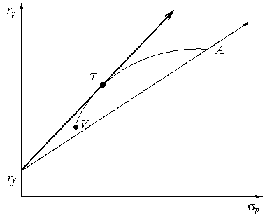 Это важно потому, что часть эффективного множества модели Марковица отсекается этой линией. В частности, портфели, которые принадлежали эффективному множеству в модели Марковица и располагались между минимально рискованным портфелем, обозначенным через V, и портфелем Т, с введением возможности инвестирования в безрисковые активы не являются эффективными. Теперь эффективное множество состоит из прямого и искривленного отрезка. Прямой отрезок идет от безрискового актива в точку Т и поэтому представляет портфели, составленные из различных комбинаций безрискового актива и портфеля Т. Искривленный отрезок расположен выше и правее точки T представляет портфели из эффективного множества модели Марковица.