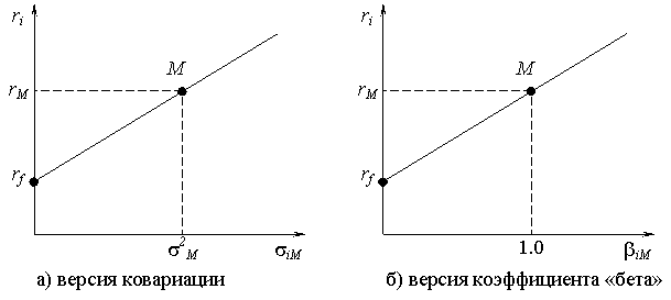 На рисунке 2.8 (а) уравнение (32) описывает прямую, пересекающую вертикальную ось в точке с ординатой rf и имеющую наклон (rM – rf)/s2M. Так как величина наклона положительна, то уравнение указывает на то, что курсы ценных бумаг с большим значением ковариаций с рыночным портфелем siM будут обеспечивать большую ожидаемую доходность (ri). Эта зависимость ковариации и ожидаемой доходности известна под названием рыночная линия ценной бумаги (Security Market Line, SML).