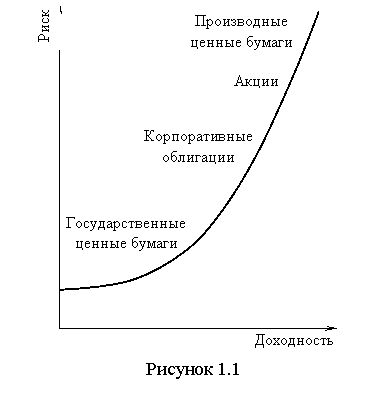 По уровню риска виды ценных бумаг располагаются следующим образом исходя из принципа: чем выше доходность, тем выше риск, и чем выше гарантированность ценной бумаги, тем ниже риск (рисунок 1.1).