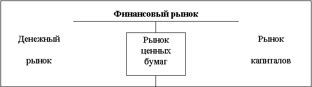 Фондовый рынок является сегментом как денежного рынка, так и рынка капиталов, которые также включают движение прямых банковских кредитов, перераспределение денежных ресурсов через страховую отрасль, внутрифирменные кредиты и т.д. (см. схему ниже).
