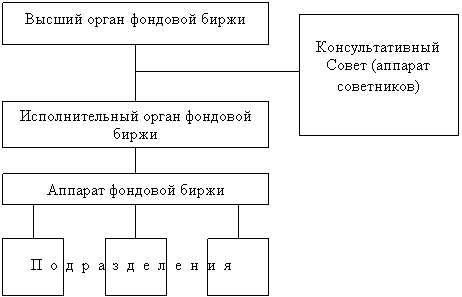 Организационная структура фондовых бирж отражает выполняемые биржами функции, которая в обобщенном виде выглядит следующим образом:
