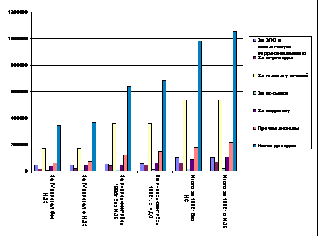 Таблица показывает, что основным видом доходов является доставка и выплата пенсий, доход от выплаты пенсий не облагается налогом на добавленную стоимость. Высокую долю занимает доход от оказания услуг КРПС “Крымтелеком” по приёму платежей от населения за пользование телефоном (рис.3.10.).