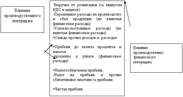Исходным в рассмотренной схеме является производственный леверидж, влияние которого выявляется путем оценки взаимосвязи между совокупной выручкой коммерческой организации, ее прибылью до вычета процентов и налогов и расходами производственного характера. К последним относятся совокупные расходы коммерческой организации, уменьшенные на величину расходов по обслуживанию внешних долгов. Влияние финансового левериджа выявляется путем оценки взаимосвязи между чистой прибылью и величиной прибыли до (выплаты процентов и налогов.