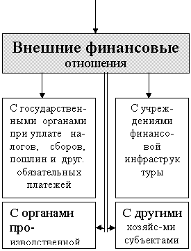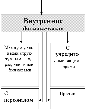 Система финансов и финансовая деятельность предприятия опосредствуют денежные отношения как внешнего, так и внутреннего характера. К внешним следует отнести финансовые отношения субъекта с бюджетами всех уровней и внебюджетными фондами по уплате налогов, сборов и пошлин; с учреждениями финансовой инфраструктуры (коммерческими банками, фондовыми и валютным биржами, страховыми компаниями, инвестиционными компаниями и т.д.); с органами производственной инфраструктуры (предприятиями транспорта и связи и т.д.); с другими хозяйствующими субъектами (покупателями и продавцами продукции). К внутренним следует отнести финансовые отношения между отдельными структурными подразделениями хозяйствующего субъекта с его учредителями, персоналом и т.д. Система финансовых отношений предприятия приведена на рис.1.2.
