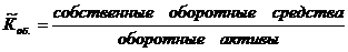 «Методическими положениями по оценке финансового состояния предприятий и установлению неудовлетворительной структуры баланса», утвержденными распоряжением Федерального управления по делам о несостоятельности (банкротстве) № ЗI-р от 12.08.94 г., определяется коэффициент обеспеченности собственными средствами, равный отношению величины собственных оборотных средств к общей величине оборотных активов (итог раздела II баланса):