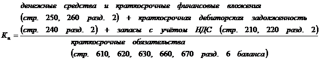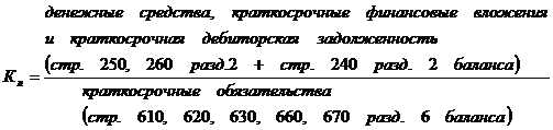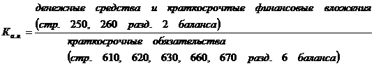 Мгновенную платежеспособность предприятия характеризует коэффициент абсолютной ликвидности, показывающий, какую часть краткосрочной задолженности может покрыть организация за счет имеющихся денежных средств и краткосрочных финансовых вложений, быстро реализуемых в случае надобности. Краткосрочные обязательства включают: краткосрочные кредиты банков и прочие краткосрочные займы, краткосрочную кредиторскую задолженность, включая задолженность по дивидендам, резервы предстоящих расходов и платежей, прочие краткосрочные пассивы. Показатель рассчитывается по формуле