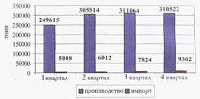 В 2001 г. российский рынок был представлен на 97,7 % отечественной продукцией и на 2,3 % импортной. На рис. 1 представлено поквартальное соотношение колбасных изделий в 2001 г. отечественного и импортного производства.
