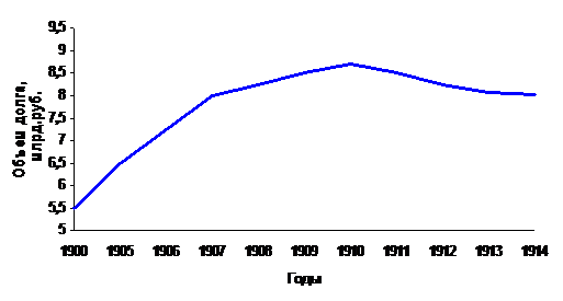 редитная история России началась в 1769 г., когда Екатерина II сделала первый заем в Голландии. За последующие два с половиной столетия Российская империя заняла на рынке примерно 15 млрд. руб. Большая часть этих средств накануне революции была погашена. К этому моменту старейшими займами в составе русского государственного долга оставались 6%-ные займы 1817-18 гг. Их нарицательный капитал составлял 93 млн. руб., а непогашенная часть к 1 января 1913г. равнялась 38 млн. руб. На графике отражена динамика государственного долга Российской империи в начале XX в.: сумма задолженности возросла в период русско-японской войны и революции, а затем стабилизировалась.