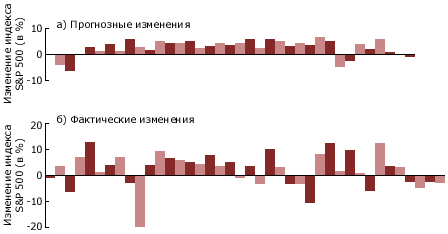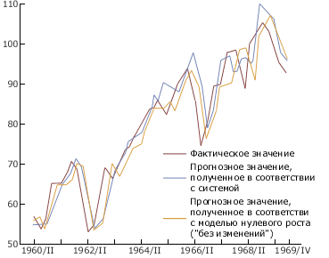Нередко можно услышать, что инвестиционная система "объясняет" значительную часть колебаний какого-либо фондового индекса. На рисунке 2 показаны квартальные значения индекса S&P 500 за 10 лет (сплошная линия) и прогнозные значения, полученные в результате построения системы на основе прошлых данных о предложении денег (линия в виде точек). Два набора значений кажутся вполне совпадающими.