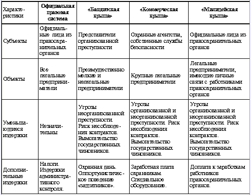 Таким образом, к концу 1990-х гг. в России сложилась “плюралистическая” система защиты прав собственности, в которой легальная государственная правоохранительная деятельность дополняется (а во многом, заменяется) двумя разновидностями нелегальной и одной легальной, но не государственной. В табл. 6 показаны основные сравнительные особенности различных существующих в современной России институтов защиты прав собственности предпринимателей.