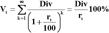 Изучив историю акционерной компании, проследив за курсом акции в течение всего периода ее существования, отметив рекорд полученных акционерами дивидендов, можно оценить: заниженный или завышенный курс имеет акция. Оценить акцию можно определив современную величину бесконечного потока дивидендов. Для постоянных дивидендов имеем на текущий момент времени t