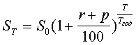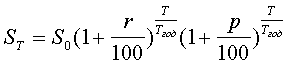 Пример 1.6 Ссуда в размере 100 млн. руб. выдана на 2 года под 64% годовых. Ожидается, что ежегодный темп инфляции будет равен 24%. S0 =100 000 000; T =730; Tгод = 365; r = 40%; p = 24% ST =301 369 600; P =201 369 600. |