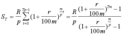 Здесь R - член ренты, т.е. величина каждого годового платежа, p - число платежей в году, m - число начислений процентов в году, T - срок ренты в годах (время от начала ренты до конца последнего периода выплат). В формуле (5) подразумевается целое число периодов выплат Tp.