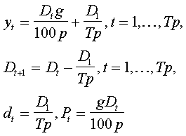 Пример 1.12 Долг 100 млн. руб. необходимо погасить равными суммами за 5 лет. Платежи производятся в конце года. За заем выплачивается 5% годовых. T = 5, D1 = 100 000 000, p = 1, g = 5, dt=20 000 000. |