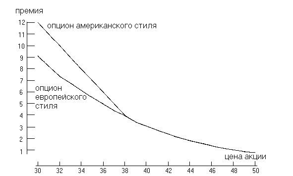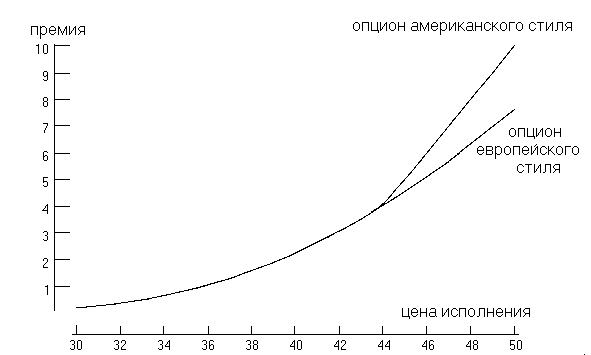 Рис.4. Зависимость премии опционов продажи американского и европейского стиля от цены исполнения