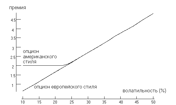 приходится моделировать свой ансамбль траекторий СДУ. На рис.5 приведены графики зависимости премии опционов продажи американского и европейского стиля от величины волатильности. Как видно из рисунка, премия опциона американского стиля превышает премию опциона европейского стиля, пока волатильность меньше 25%. При