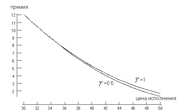 На рис.7 приведены графики зависимости премии опциона купли американского стиля от цены исполнения, вычисленные по линейной непрерывной и нелинейной дискретной модели цены базисного актива. Решение о том, какая из этих двух моделей лучше соответствует реальным данным, принимается в каждом конкретном случае.