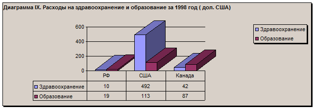 Диаграмма IX показывает количественный расход на образование и на здравоохранение на душу населения. В США на здравоохранение выделяется в 11,7 раз и в 5,9 раз средств больше, на образование в 1,3 раза и в 42,2 раз больше, чем в Канаде и в РФ соответственно.