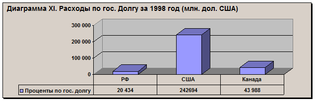 Государственный долг наиболее актуальная проблема в России, в США и Канаде она стоит не так остро, хотя долг США равен 5’543’589 млн. долларов США, в Канаде – 615’931,3 млн. долларов США, а в РФ – 240’503,7 млн. долларов США. В расходной части бюджета определяется специальная статья для этой цели. Диаграмма XI показывает уровень данных расходов в этих странах.