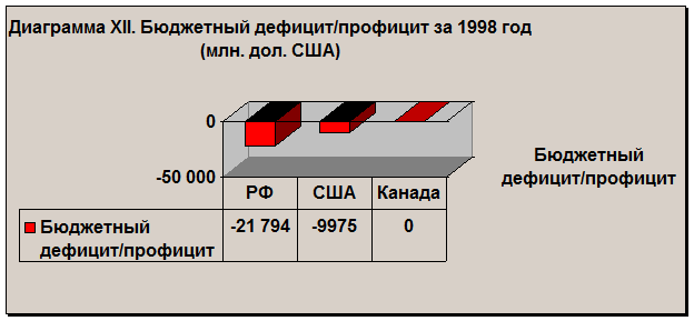 Бюджетный дефицит – превышение расходов над доходами – в РФ составлял в 1998 году 4,66% от ВВП, в США – 0,12%.