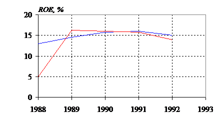 Анализ может быть дополнен построением графиков, как показано на рис. 1.1. Мы построили кривые ROE компании «Southern Metals» и средней ROE в промышленности за последние пять лет. График показывает, что ROE «Southern Metals» падала с 1989 г. даже несмотря на то, что среднее значение в промышленности было относительно стабильным. Подобным образом можно подвергнуть анализу и другие коэффициенты.