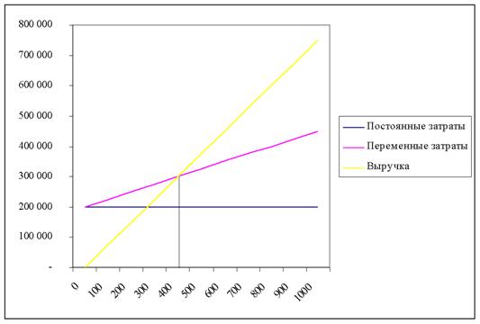 Рассмотрим конкретный пример: Постоянные издержки 200,000, переменные – 250/шт., цена 750/шт.