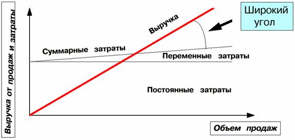 Высокий уровень постоянных издержек при низком уровне переменных затрат на единицу продукции.