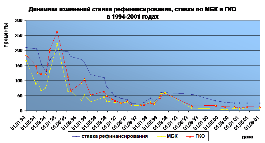 На представленном рисунке приведено графическое изображение изменений ставок рефинансирования, ставок по МБК и ГКО в период с 1994 по 2001 год. Можно заметить, что изменения ставки рефинансирования отстают от соответствующих изменений других процентных ставок.