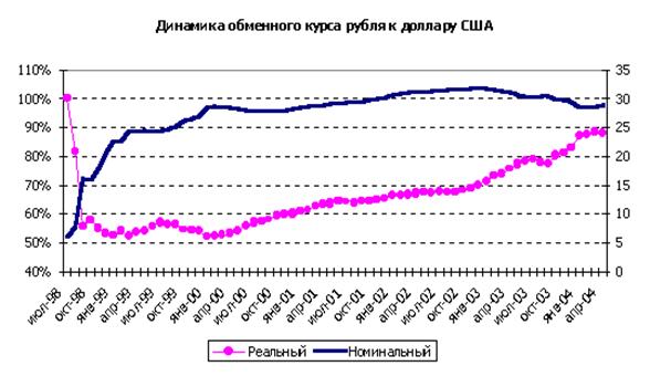 В итоге удалось за довольно короткий промежуток времени обеспечить сближение краткосрочных показателей доходности основных активов, номинированных в иностранной валюте и рублях. Это позволило Банку России сбалансировать к началу лета потоки краткосрочного капитала и существенно сократить свое участие на валютном рынке, повысив уровень его саморегулируемости. Номинальный курс рубля к доллару США по итогам девяти месяцев 2003 года вырос на 4,1%,в то время как по отношению к евро номинальный курс рубля снизился на 5,4%. По итогам девяти месяцев 2003 года реальный эффективный курс рубля по отношению к декабрю 2002 года повысился на 3,9%. Относительная стабильность номинального обменного курса рубля способствовала притоку иностранных инвестиций и техническому переоснащению производства.